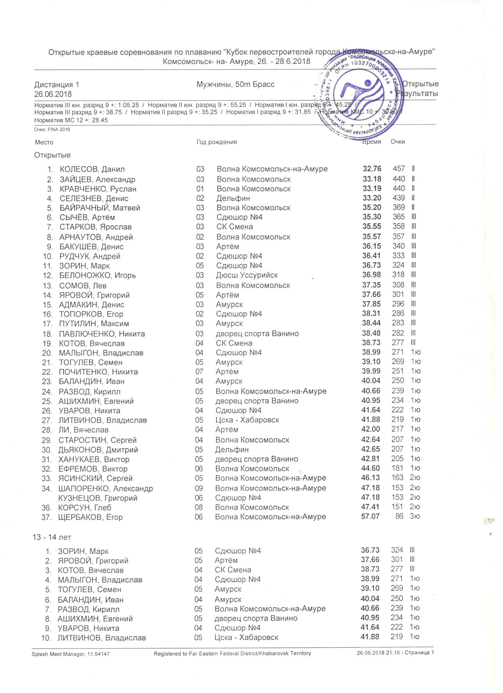 Итоговый протокол Кубка г. Комсомольска-на-Амуре