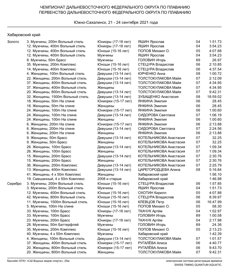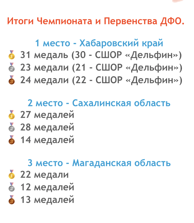 В Южно-Сахалинске завершился чемпионат и первенство ДФО по плаванию. В соревнованиях выступило 230 сильнейших спортсменов практически со всех регионов, за исключением ЕАО и Чукотки. Хабаровский край был представлен внушительным составом – 50 участников, из них 39 -воспитанники СШОР «Дельфин». Команда нашего края завоевала 78 наград (31 золотая) и заняла первое место в медальном зачете. На втором – Сахалинская область, на третьем – Магаданская.
