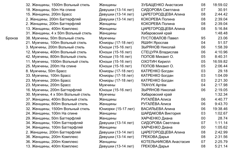 Помимо вышеперечисленных спортсменов мульти-медалистами соревнований в составе нашей команды стали: Ярослав Яшин, Владислав Стецура, Диана Харченко, Светлана Сидорова, Виктория Шардакова, Алина Царегородцева и Михаил Попов. Также стоит отметить самую юную нашу участницу - Майю Толстокулакову, которая неожиданно для тренеров выиграла дистанцию 400 метров вольным стилем и в чемпионате, и в первенстве ДФО.