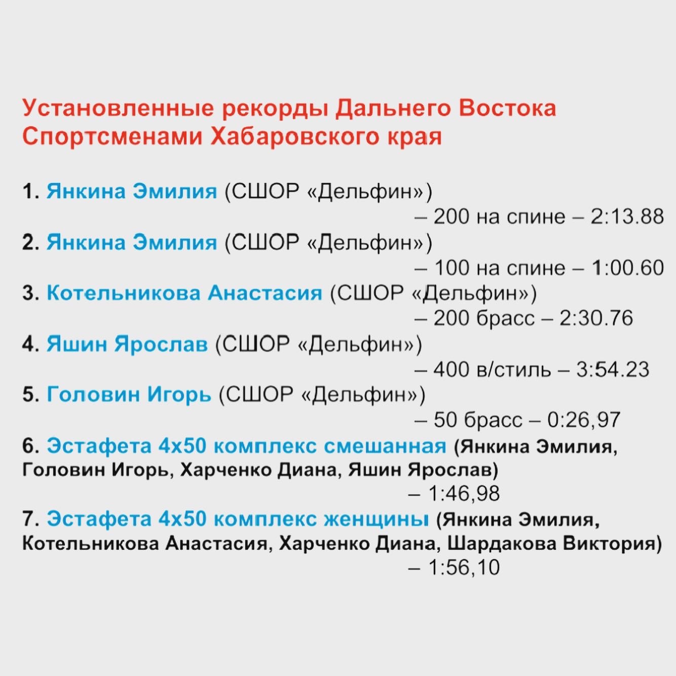 Спортсмены сборной Хабаровского края установили целую серию новых рекордов Дальнего Востока. Особенно стоит отметить Эмилию Янкину, среди девушек она набрала больше всех очков за одну дистанцию, также установила два рекорда в личных заплывах и два - в командных. Побила высокие результаты, показанные в прошлые годы, при этом опередила члена сборной страны, представительницу Южно-Сахалинска. Также три своих дистанции, но уже в брассе, выиграла Анастасия Котельникова и стала обладательницей рекорда Дальнего Востока.