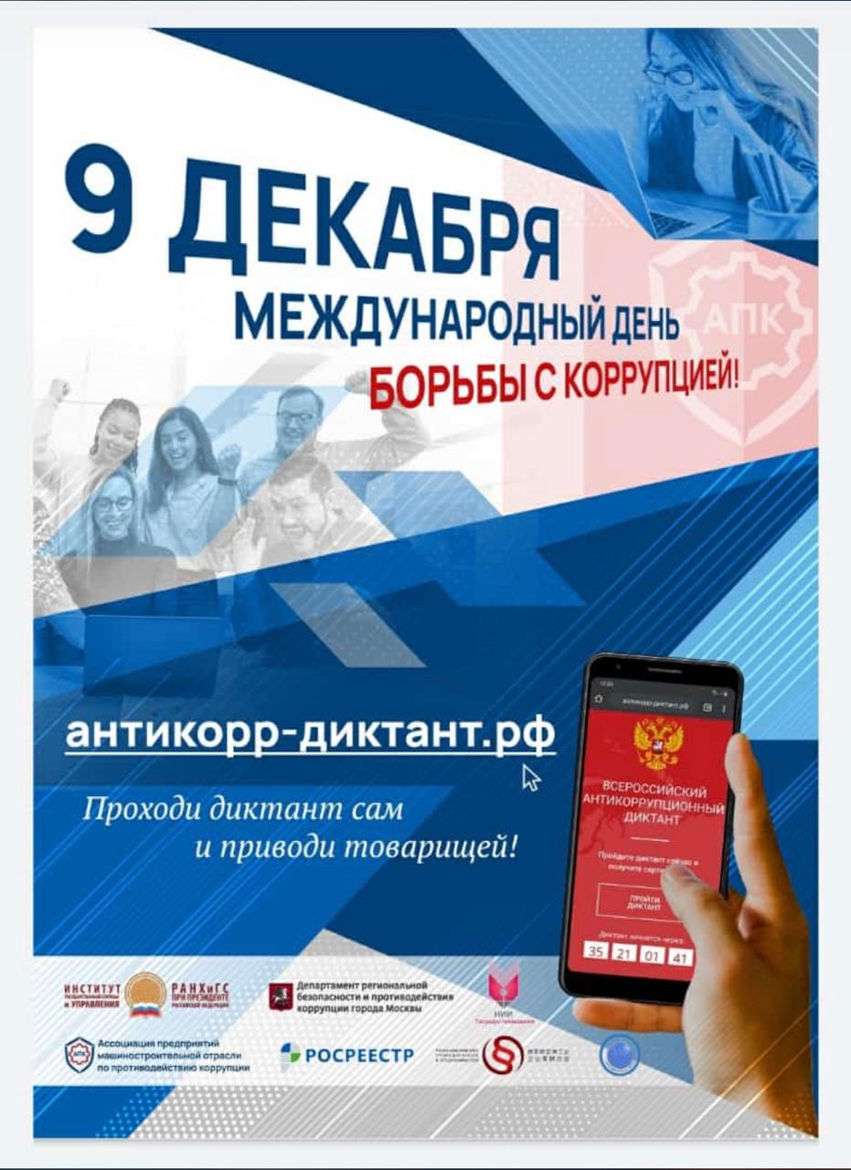 9 декабря отмечается международный день борьбы с коррупцией. III Всероссийский антикоррупционный диктант состоится с 9 по 11 декабря 2022 года. Это мероприятие - федеральный образовательный проект, реализуемый в рамках Указа Президента РФ "О национальном плане противодействию коррупции".